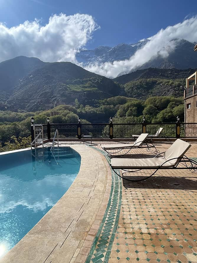 Kasbah du Toubkal invites guests to enjoy their newly restored outdoor pool, offering breathtaking views of Morocco’s High Atlas Mountains.